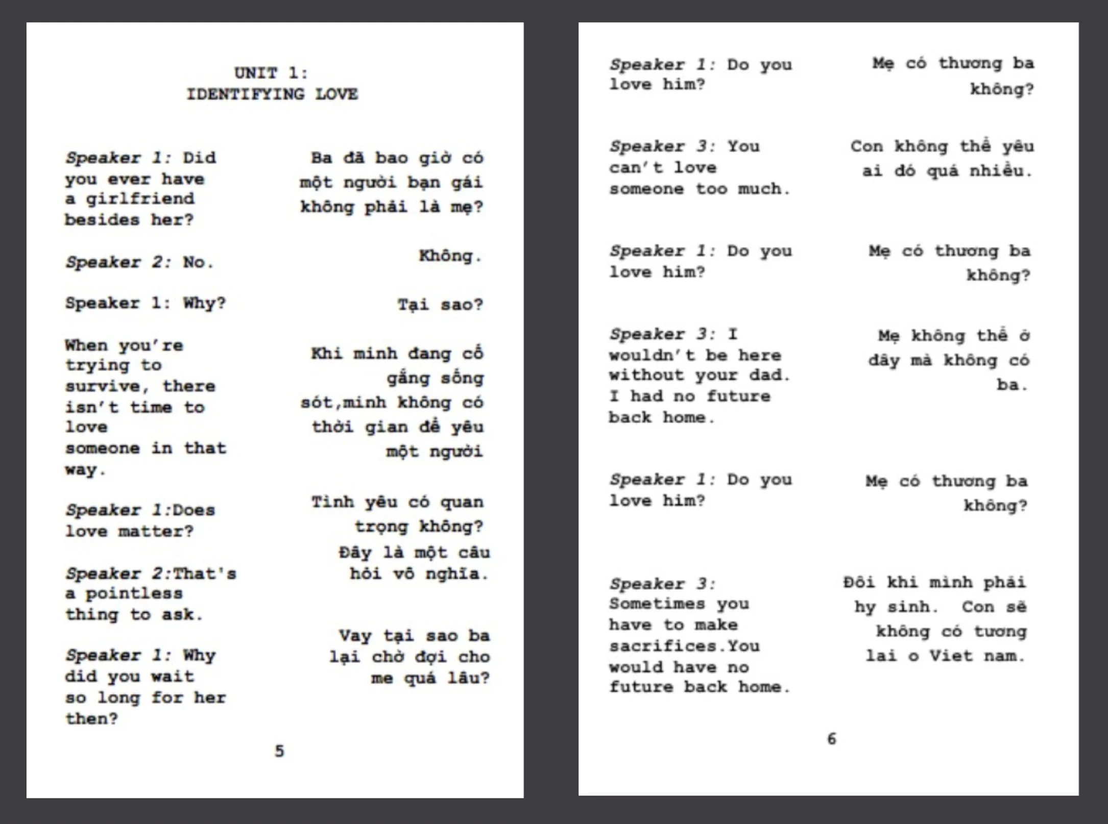 My project is inspired by a Vietnamese-English phrasebook that my father received while in a refugee camp. The phrasebook, formatted as basic dialogues between two people in conversation, was developed with the goal of helping Vietnamese refugees bridge the language and cultural barriers upon arriving to the US, Canada and Australia.